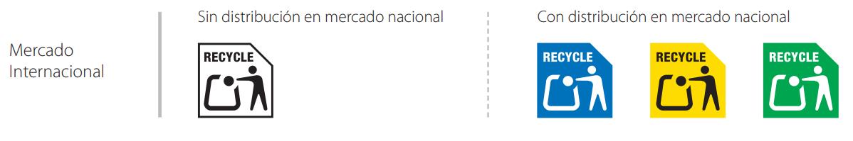 Además, existen versiones en inglés, francés, italiano y portugués, y  un símbolo genérico para envases destinados a varios países o que se pongan directamente en el mercado internacional.  Si el mismo envase también tiene distribución en el mercado nacional, siempre que sea posible, debería aparecer con el color correspondiente.
